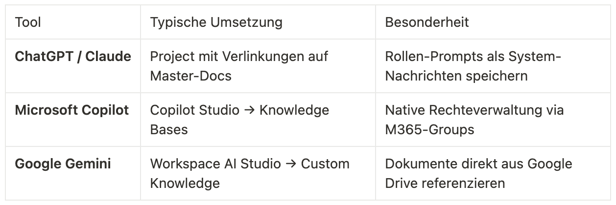 🧠 Min-Max-Tipp: Lege beide Master-Dokumente als Cloud-Dokumente an (z.B. Google Docs oder Confluence). So hast du eine zentrale Quelle, die du in allen KI-Tools verlinken kannst. Eine Änderung aktualisiert automatisch alle KI-Assistenten.