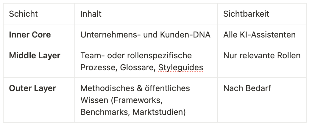 Nicht jeder KI-Assistent braucht Zugriff auf alle Informationen. Deshalb strukturieren wir das Wissen nach dem Zwiebel-Prinzip in drei Schichten: